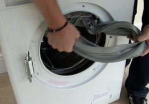 2. Установка новой манжеты. Предварительно перед установкой мастер тщательно очищает кромку бака от накопившейся грязи. После этого происходит непосредственно установка манжеты на штатное место – посадочные места мастер смазывает мыльным раствором и натягивает уплотнитель на кромку бака. При этом он следит за тем, чтобы совместились установочные метки, расположенные на манжете (резиновый наплыв) и на баке агрегата. Затем мастер устанавливает фиксирующие хомуты – сначала внутренний, а затем передний.
